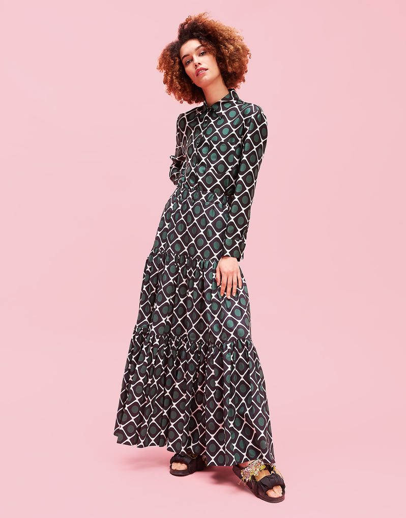Our peasant comes in a lightweight cotton poplin, but the voluminous tiers of the printed fabric can take it from a casual outing to a major occasion-moment in a snap. The fit is relaxed and comfortable thanks to its elastic waist. You can wear it up high as a strapless maxi dress (it looks great belted!) or traditionally at your waist or slung down below the hips.