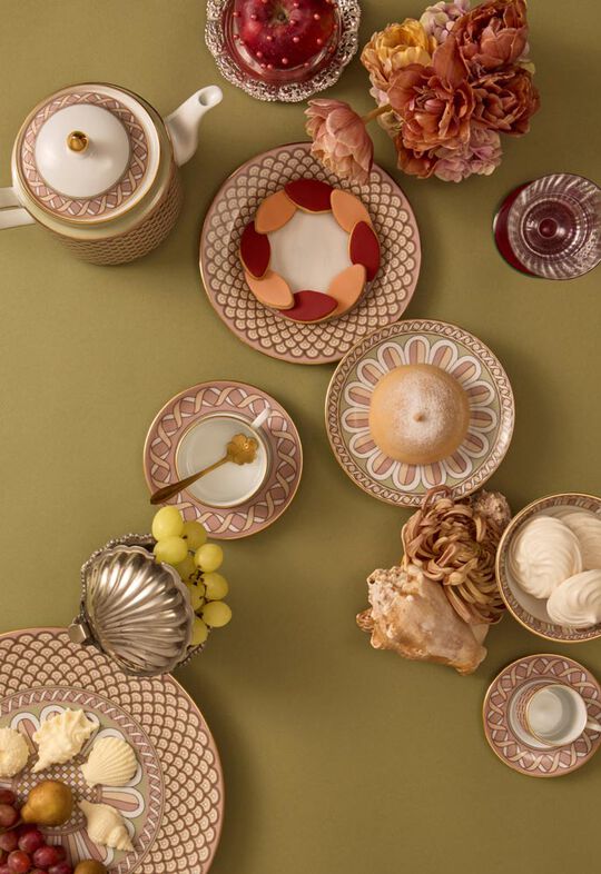 Part of our ravishingly retro collaboration with 1stDibs, this set of two Dessert Plates arrives in a vintage geometric print crafted from fine porcelain by our historic Italian partners, Ancap. The 1stDibs collection offers six different color combinations built in mix ’n match maximalism, or use this set to add a jolly jolt to your white tableware at home. Finished with 18k gold trims, these plates do double duty, so snag a few for your salad course or dot around as a handy spot for keys or crystals as well.